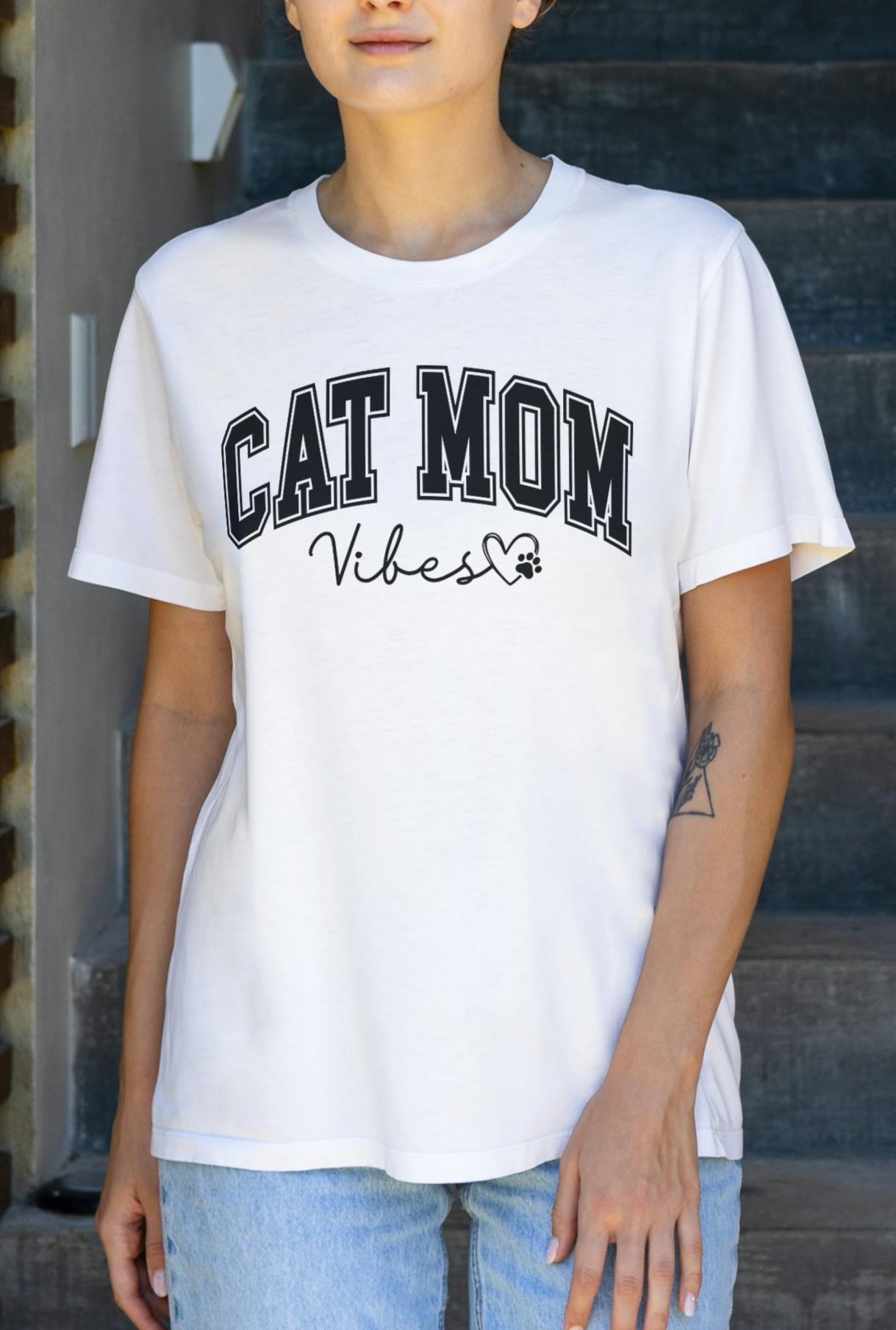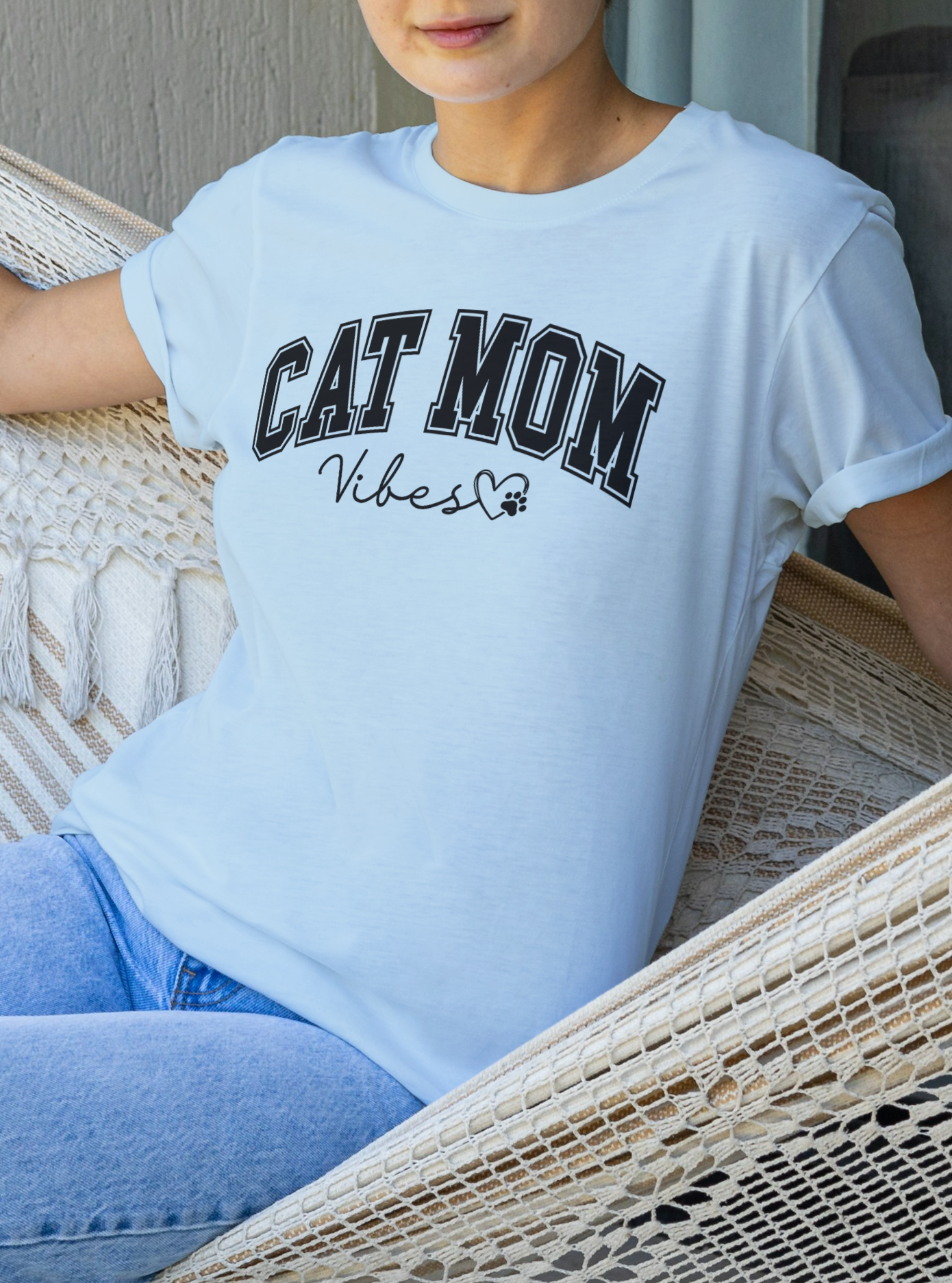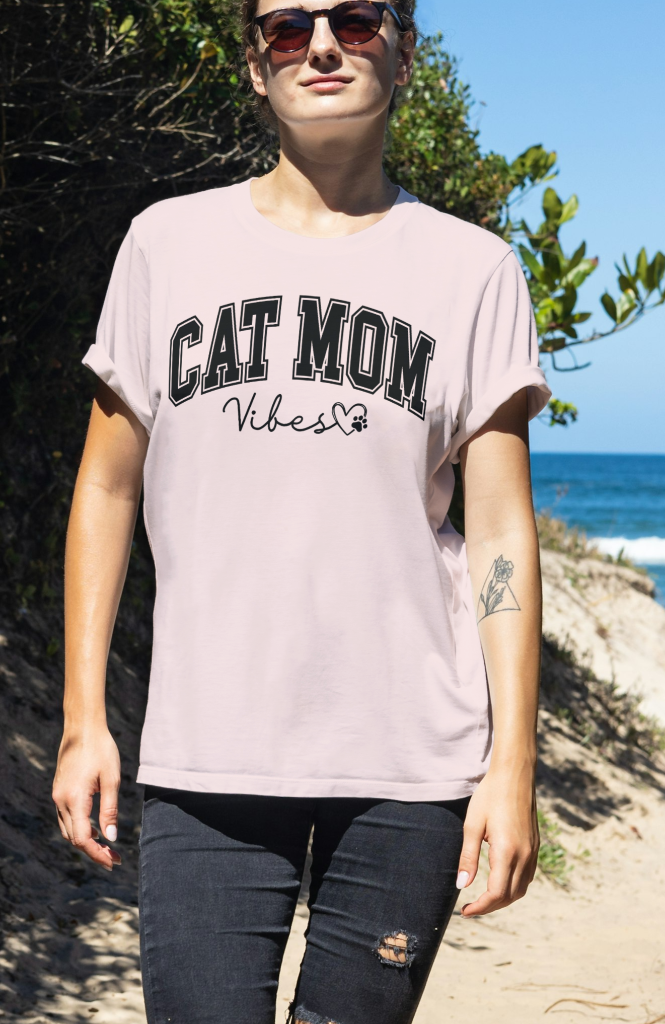 🐱 Calling all cat moms who are proud to flaunt their feline love! ❤ Get ready to channel those purr-fect "Cat Mom Vibes" with our Unisex Bella + Canvas t-shirt, featuring a university-style font that screams sophistication with a hint of kitty charm.