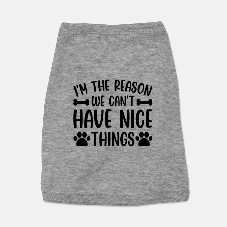 Your best friend will look cute and stylish in this pet tank-style shirt while showing the world the reason you cant have nice things. But hey, we know you still love your furbaby no matter what! Available in a variety of sizes. Makes an awesome gift for another fellow pet parent.