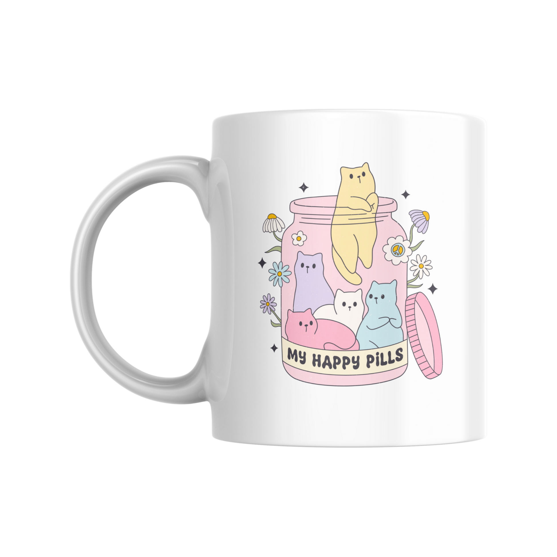 Enjoy this beautiful ceramic mug is perfect to show mental health awareness with what else than cat happy pills!. Your morning coffee, a hot chocolate, or any other hot beverage you enjoy. The mug is glossy white and the prints come out beautifully and vividly on it. The print retains its quality and luster when used in both microwaves and the dishwasher.