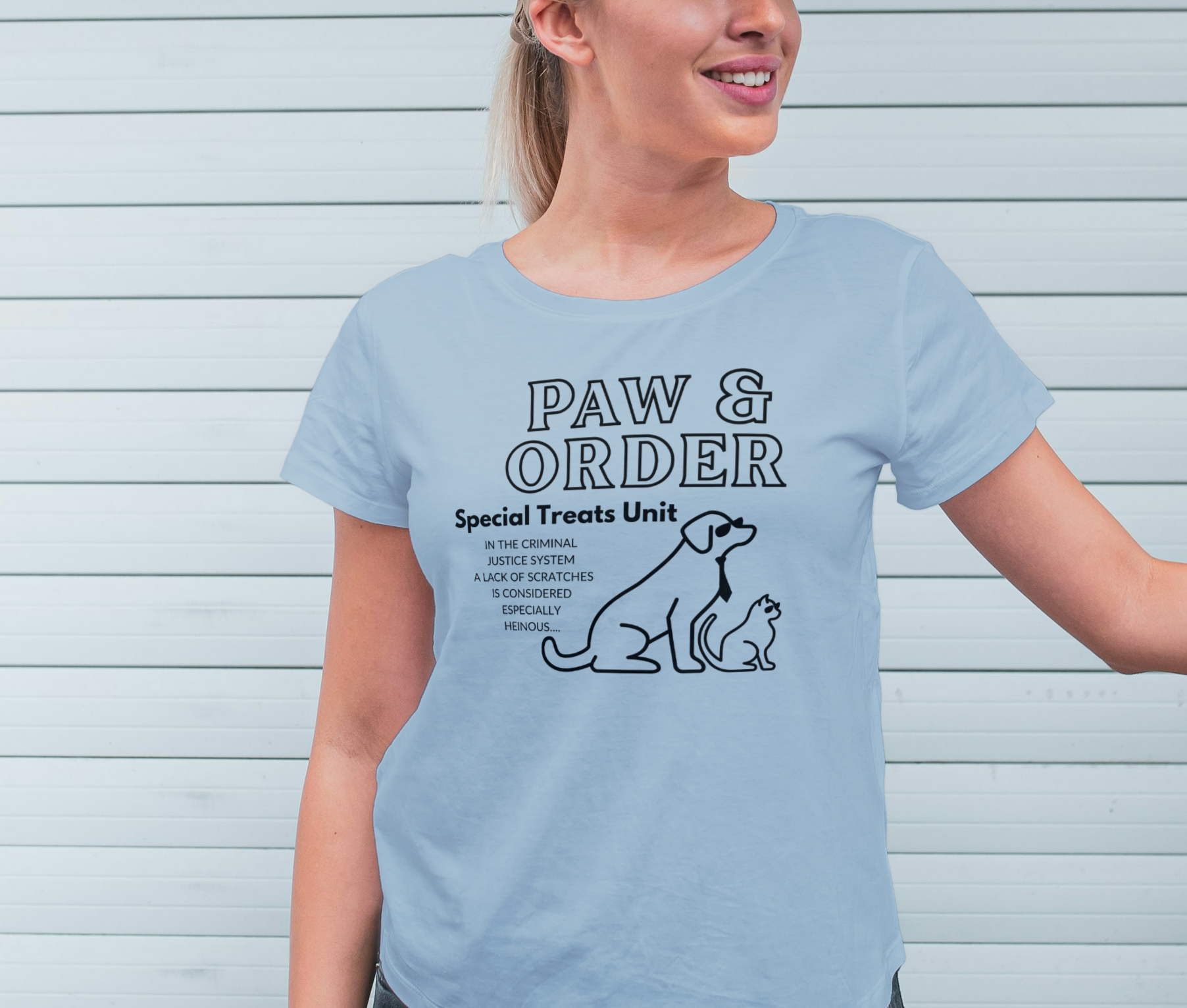 The shirt reads "PAW & ORDER, Special Treats Unit, In the criminal justice system a lack of scratches is considered especially heinous...."