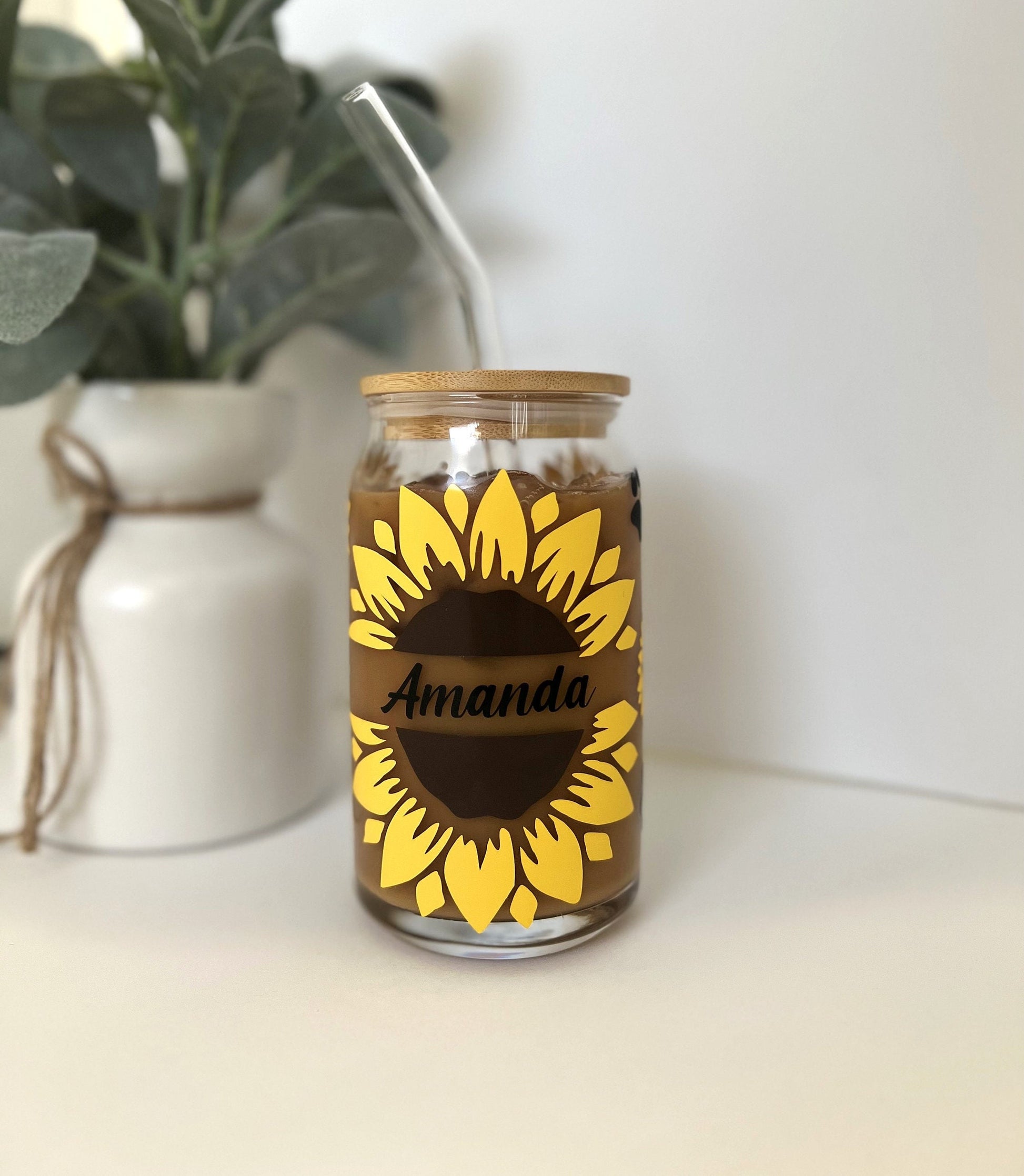 🌻 Shine bright with our personalized glass can adorned with a stunning sunflower made of permanent vinyl! 🌞 This isn't just any drinkware—it's a sunny accessory that adds a pop of personality to your sipping routine.